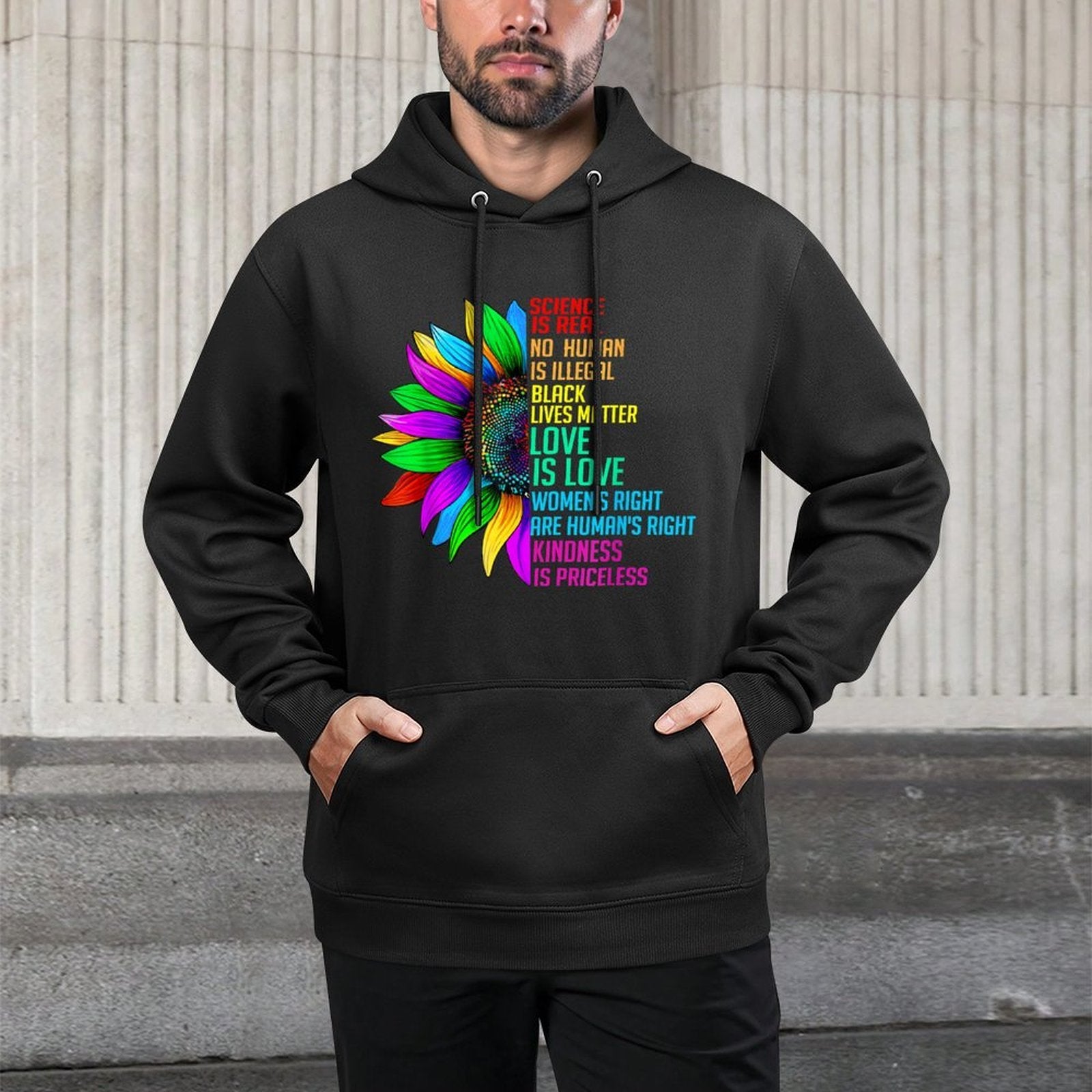 Elevate your casual wardrobe with the Sunflower Rainbow Science Is Real Black Lives Matter LGBT Hoodie – crafted from premium 60% cotton and 40% polyester for everyday comfort and durability. Designed for Sunflower Rainbow Science Is Real Black Lives Matter LGBT style enthusiasts who value both fit and function, this unisex sweatshirt features a relaxed silhouette, breathable fabric, and versatile streetwear appeal. Whether you're exploring the city, relaxing at home, or meeting friends for a Sunflower Rainbow Science Is Real Black Lives Matter LGBT weekend outing, this hoodie delivers softness, style, and easy care in one timeless piece.