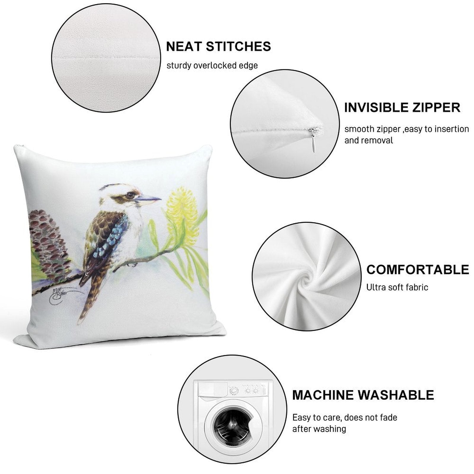 - Reinforced stitching along the edges prevents fraying and extends the life of your The Contented Kookaburra Pillowcase.